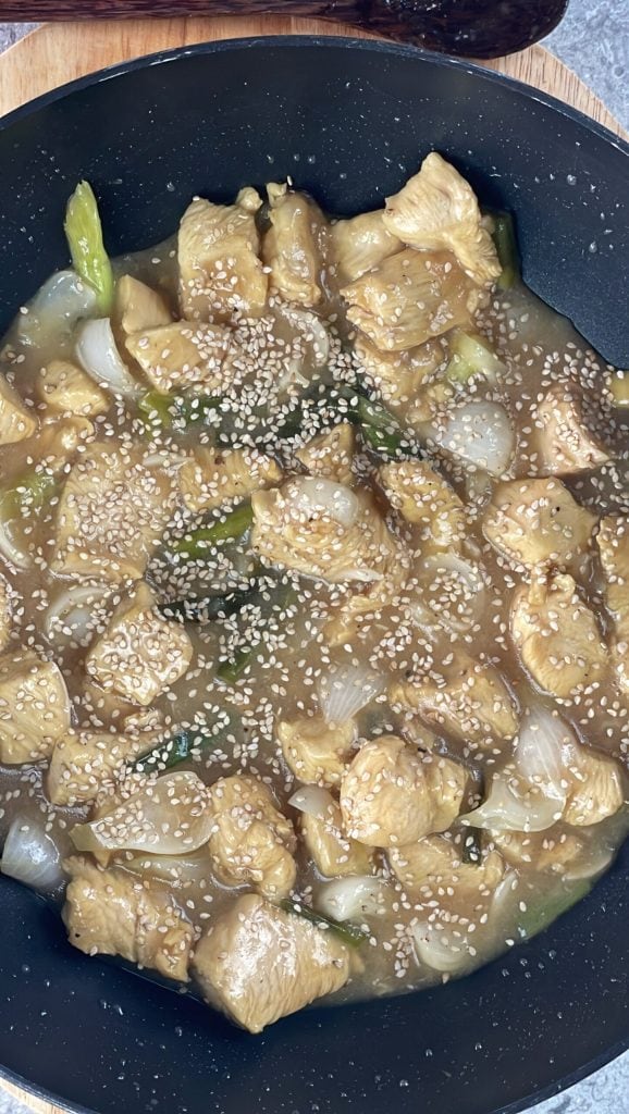 O segredo para obter um frango macio e suculento é a marinada com amido de milho e vinagre de arroz, que deixa a carne mais macia e permite que o molho adira melhor durante o cozimento. As cebolinhas, por sua vez, adicionam uma nota levemente doce, realçando o sabor do frango sem encobri-lo. Uma última pitada de sementes de gergelim dá um toque crocante que torna cada mordida ainda mais convidativa.