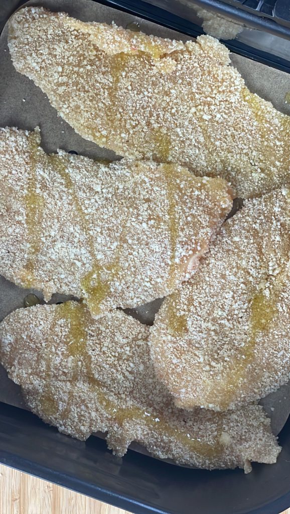 Peito de frango empanado com parmesão na fritadeira a ar, um prato principal crocante, saboroso e leve, adequado para toda a família.