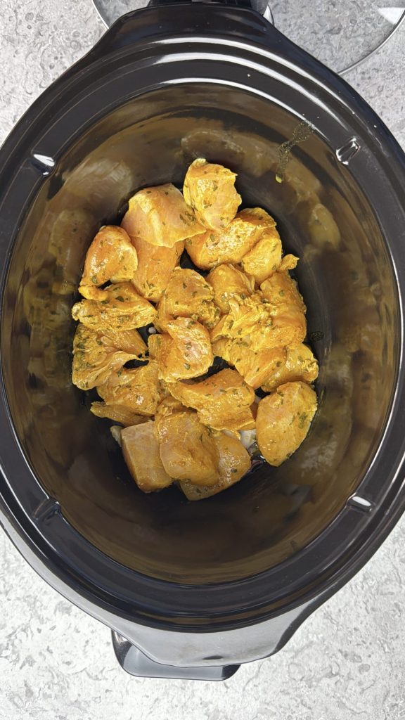 Frango temperado com curry na slow cooker, uma receita fácil e leve, perfeita para obter pedaços de frango macios e perfumados com o mínimo de esforço. Ideal para o preparo de refeições e para quem gosta de cozimento lento.