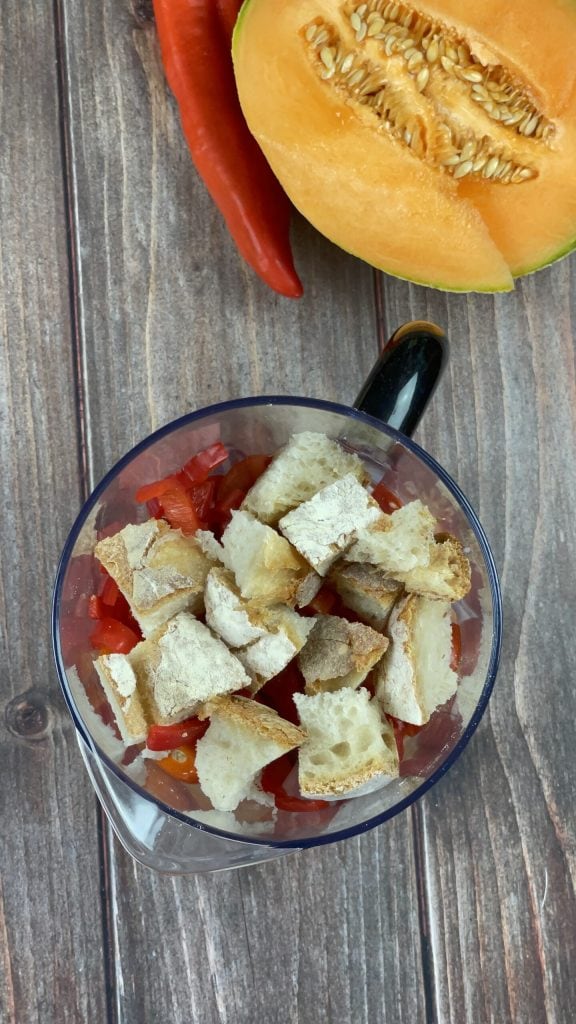 Gazpacho de melão e pimentões, uma variante fresca e deliciosa do tradicional gazpacho espanhol. Esta sopa fria é perfeita para o verão, combinando a doçura do melão com o sabor marcante dos pimentões.