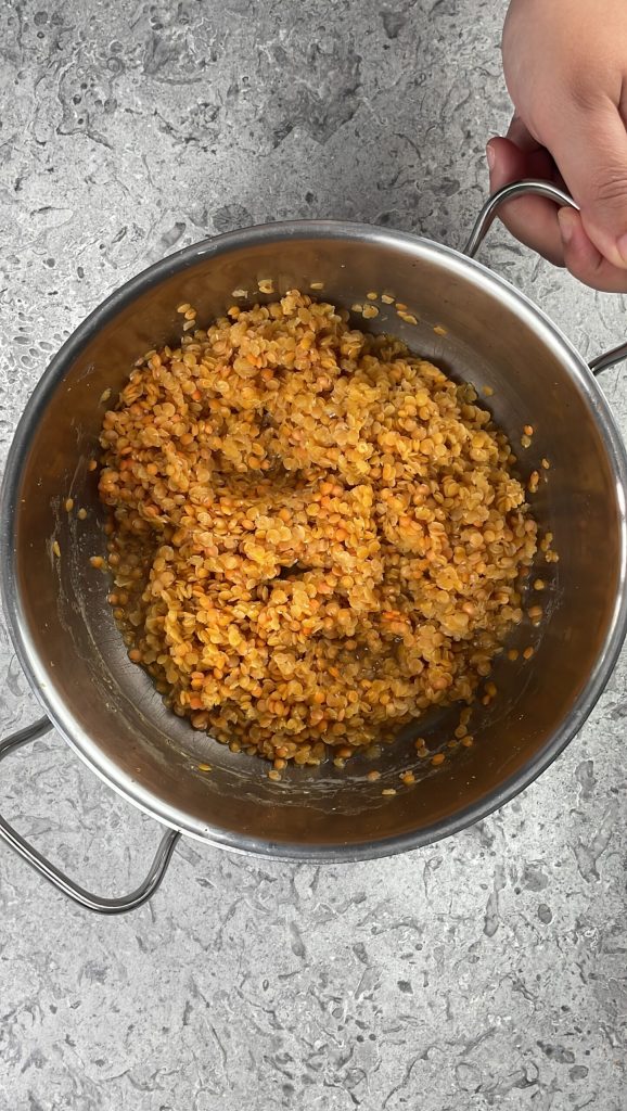 Inicie a preparação do hummus de lentilha enxaguando as lentilhas vermelhas descascadas e tomando cuidado para eliminar eventuais pedrinhas ou pedaços de terra.