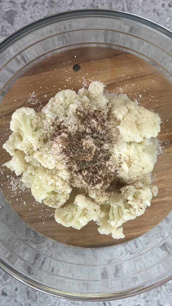 Tempere o restante da couve‑flor com pimenta‑do‑reino, noz‑moscada e Parmigiano Reggiano ralado.