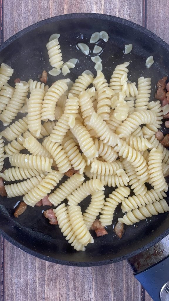Eu não adicionei mais gordura, mas se preferir, você pode cozinhá-lo com uma colher de chá de azeite de oliva extravirgem.Escorra o macarrão al dente diretamente na frigideira com o bacon.