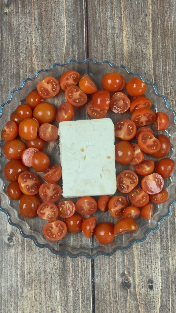 • Comece o preparo da massa com feta e tomatinhos colocando em uma assadeira os tomatinhos cereja cortados ao meio e o feta grego.
