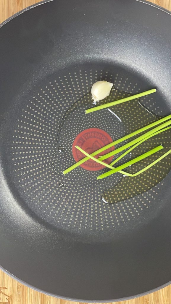 Deixe fritar por 2-3 minutos.Retire da panela tanto o dente de alho quanto os talos de salsa.