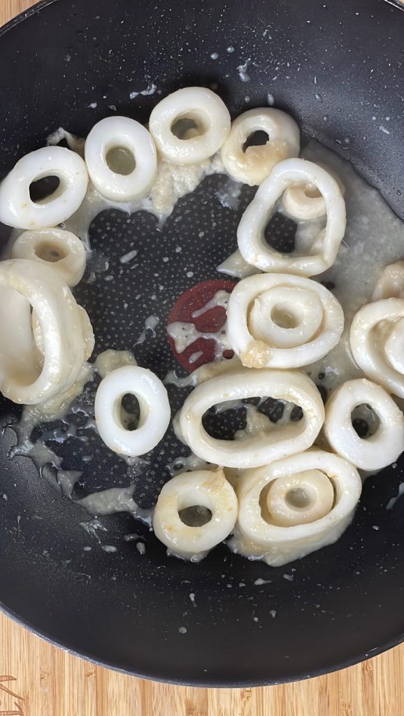 Coloque dentro as lulas cortadas em anéis e cozinhe por 5 minutos.