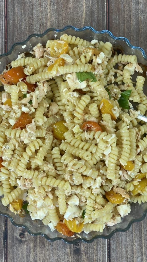 Complete a preparação da massa feta, salmão e tomatinhos com algumas folhas de manjericão fresco.
