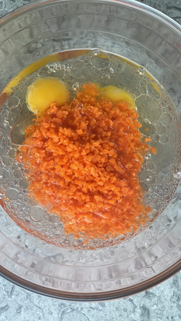 Adicione as cenouras raladas, a água e o óleo.