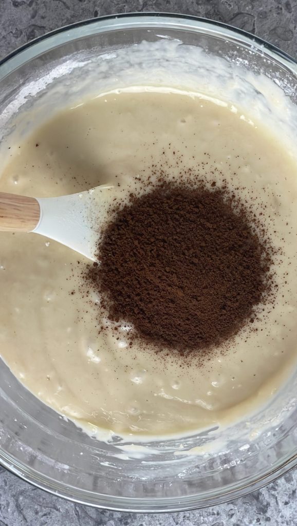 • Peneire a farinha 00 e o fermento em pó para doces diretamente na tigela com os ingredientes líquidos.