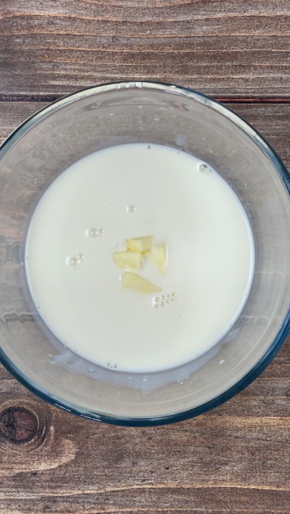 Se não tiver um micro-ondas, pode usar uma panela pequena.Quando a mistura de buttermilk e manteiga estiver morna, adicione também o açúcar e o fermento.
