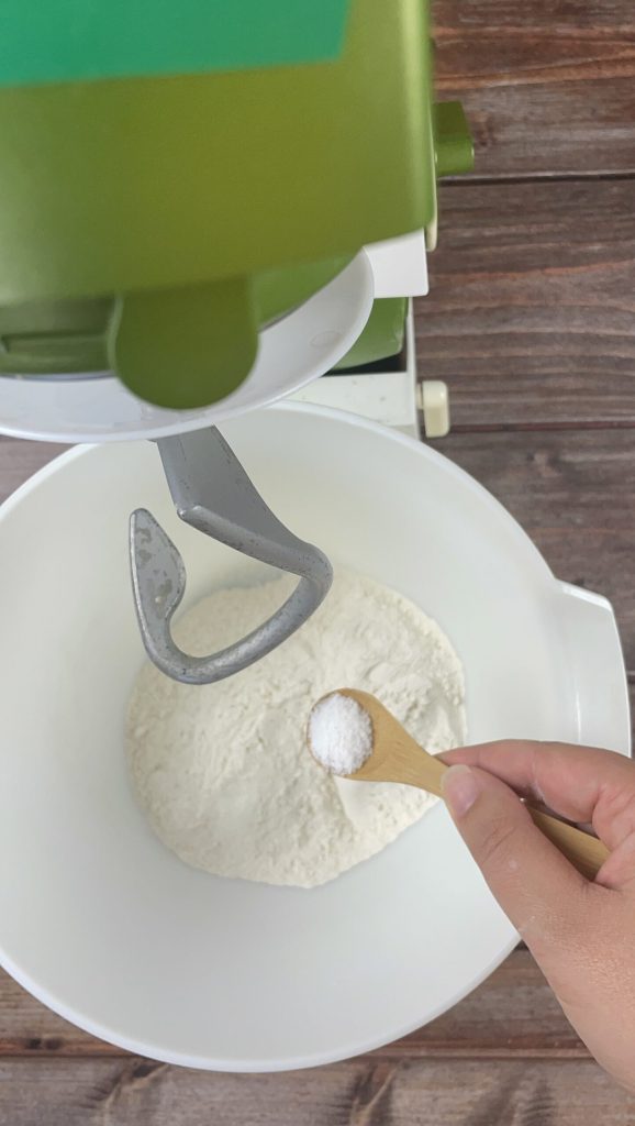 Adicione meia colher de chá de sal e misture bem.Agora, você pode colocar os ingredientes líquidos na tigela da batedeira.