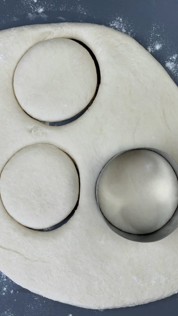 Com a ajuda de um cortador de massa ou de uma xícara, corte os muffins e coloque-os na assadeira coberta com papel manteiga enfarinhado.