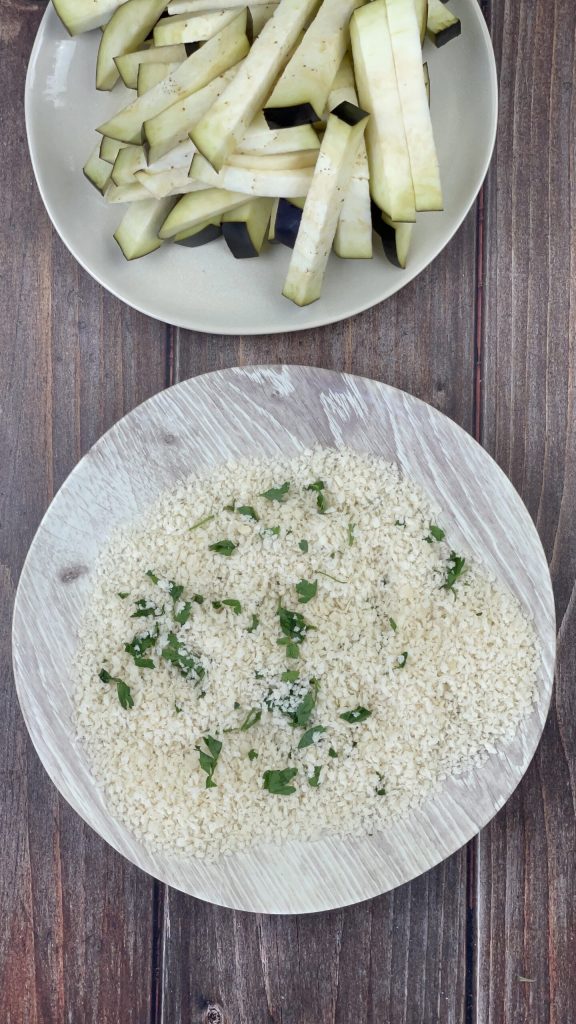 Passe os bastonetes de berinjela primeiro na massa e depois no panko.