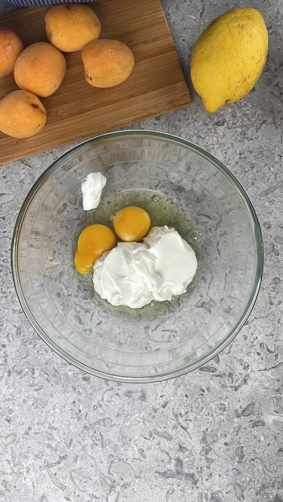 Comece a preparar as panquecas de damasco e iogurte grego colocando os ovos e o iogurte grego em uma tigela.