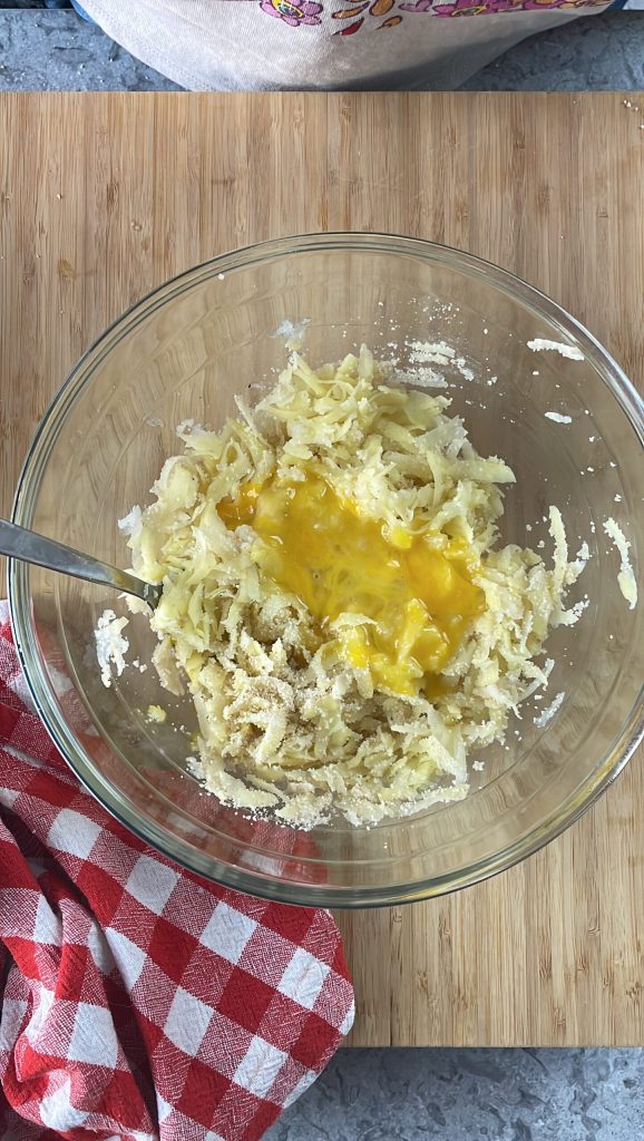 Esprema bem as batatas raladas para remover o excesso de água.Transfira as batatas raladas para uma tigela.