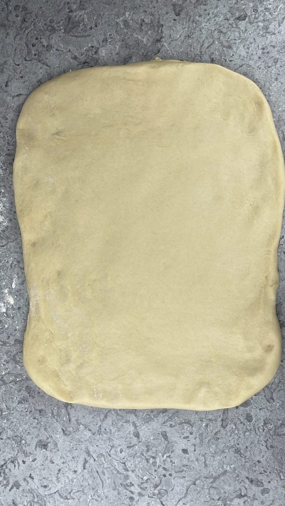 • Retome a massa fermentada e estenda formando um retângulo: o lado curto deve ter o comprimento da forma ou um pouco menos, no nosso caso, 30 cm.