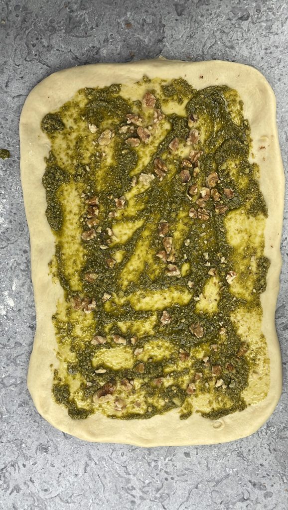 • Espalhe o pesto de manjericão sobre a massa e adicione as nozes grosseiramente picadas, deixando 1-2 cm livre em cada lado.