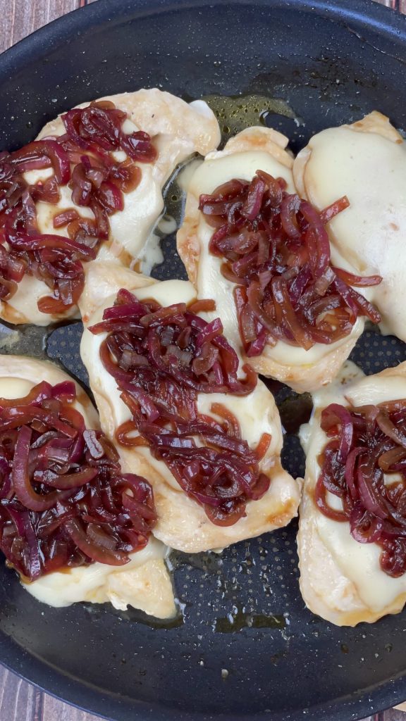 Continue o preparo do frango colocando sobre a scamorza a cebola cozida anteriormente.