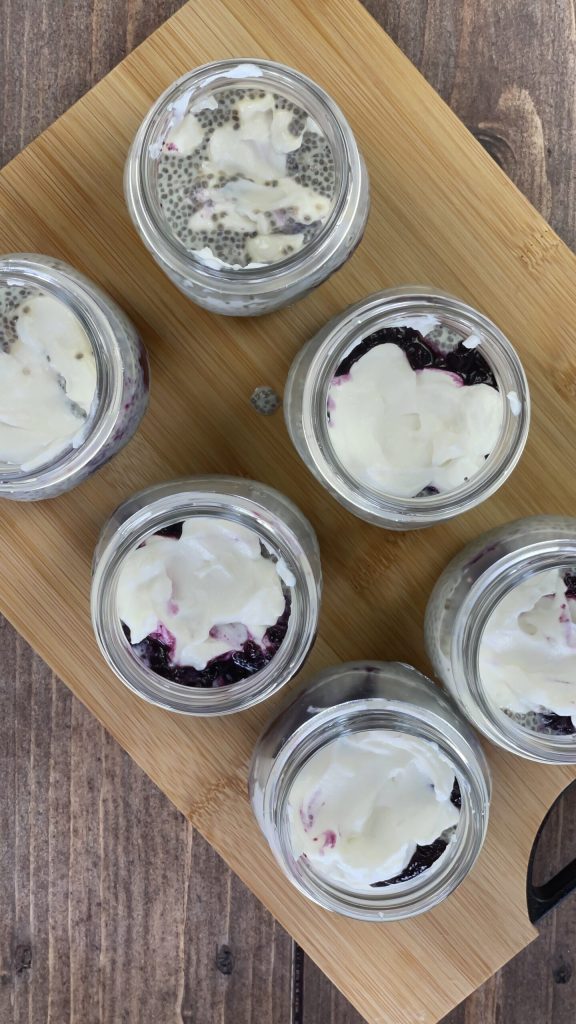 O pudim de chia com frutas está pronto para o seu café da manhã ou feche os potes com a tampa apropriada e guarde-os na geladeira.