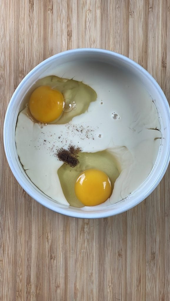 Comece a preparar as rabanadas de chocolate colocando em uma tigela dois ovos médios, meio copo de leite ou bebida vegetal e uma colher de chá de extrato de baunilha (como alternativa, uma pitada de baunilha em pó).