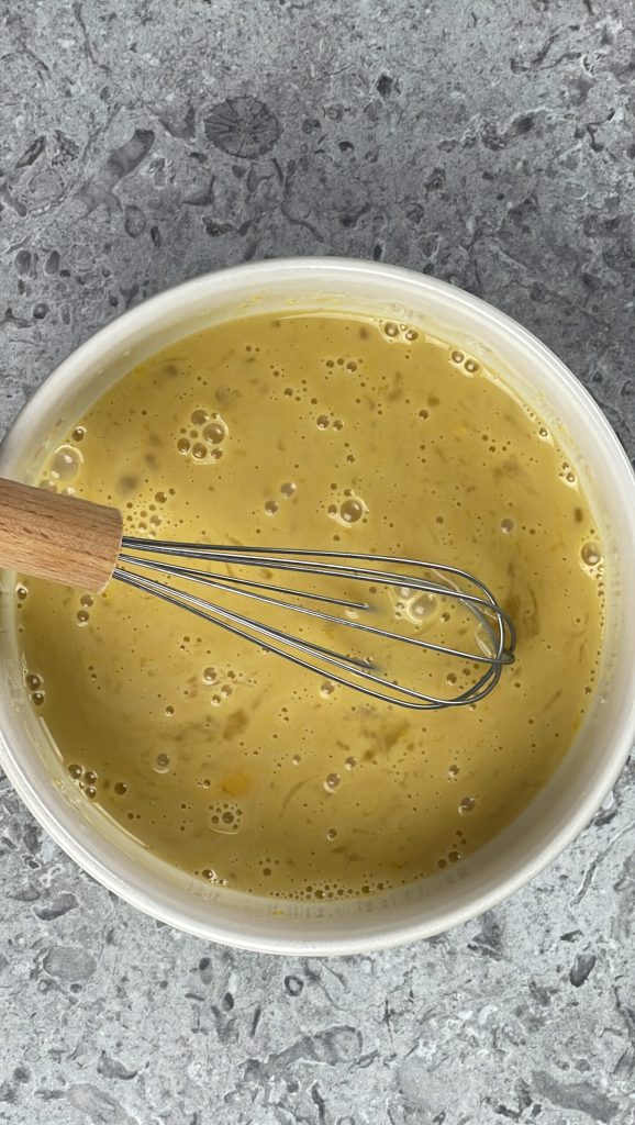 Misture bem e deixe macerar por pelo menos 30 minutos.Em outra tigela, quebre um ovo de tamanho médio.