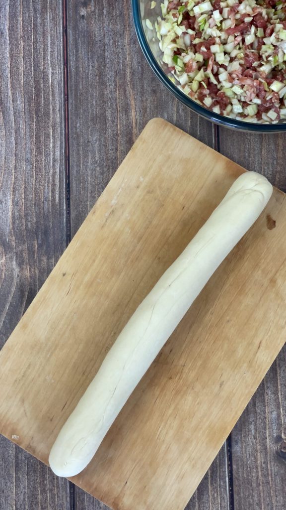 Adicione à carne e misture até que esteja completamente incorporado ao restante dos ingredientes.Retome a massa dos raviolis e estenda formando um rolo de cerca de 30 cm.