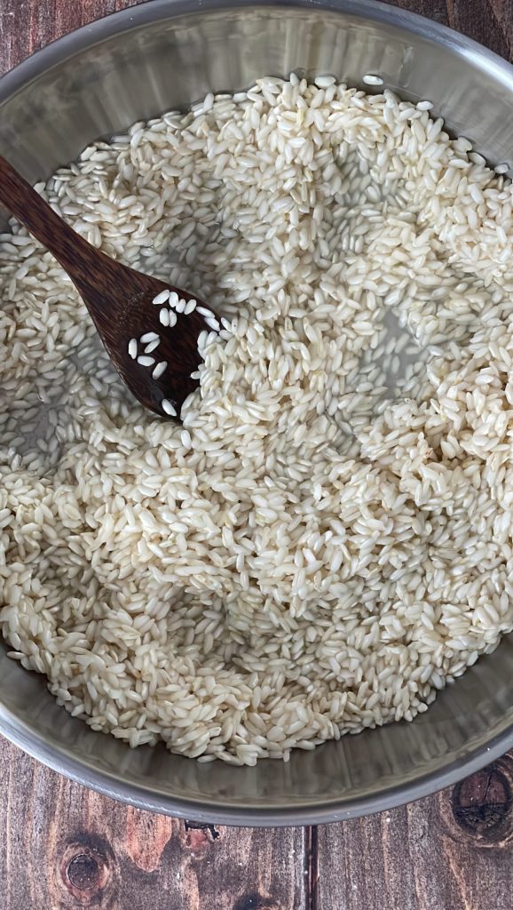 Por enquanto, deixe de lado.Aqueça uma panela no fogão. Adicione o arroz Carnaroli e toste-o a seco por alguns minutos.