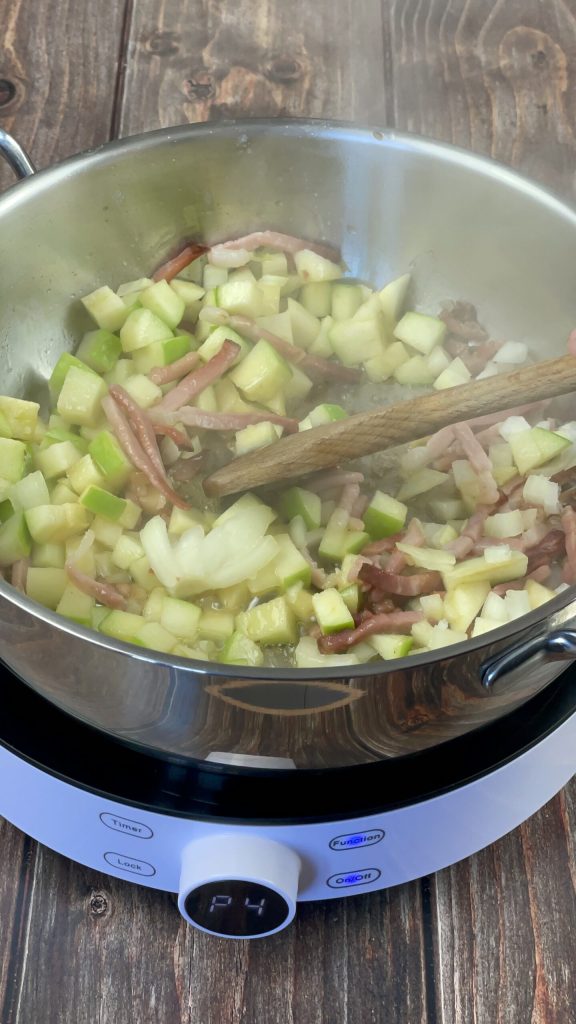 Adicione a maçã e a cebola ao speck e cozinhe em fogo baixo por cerca de 5 minutos.