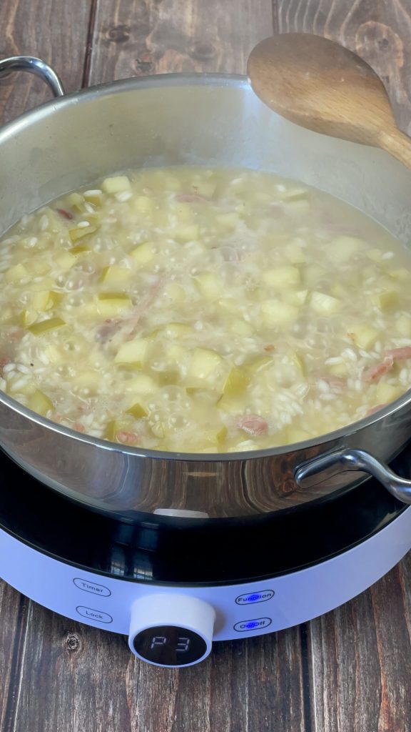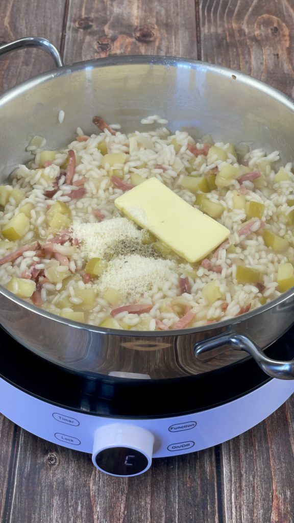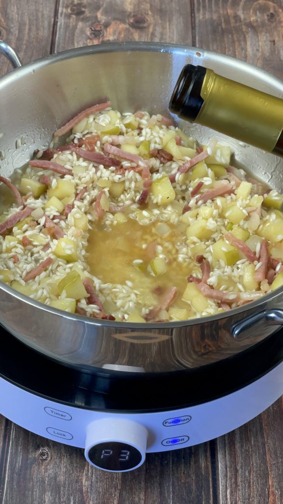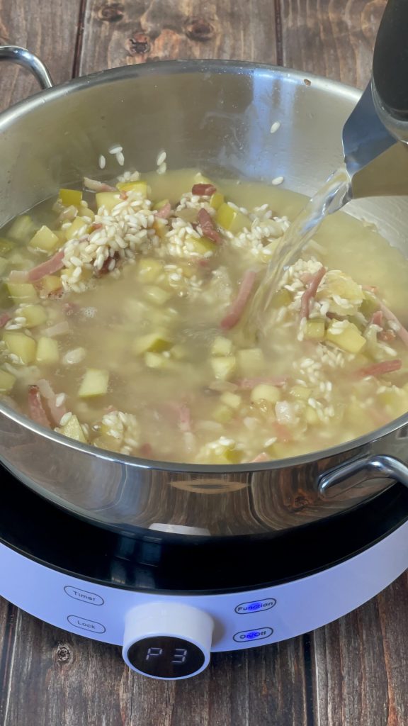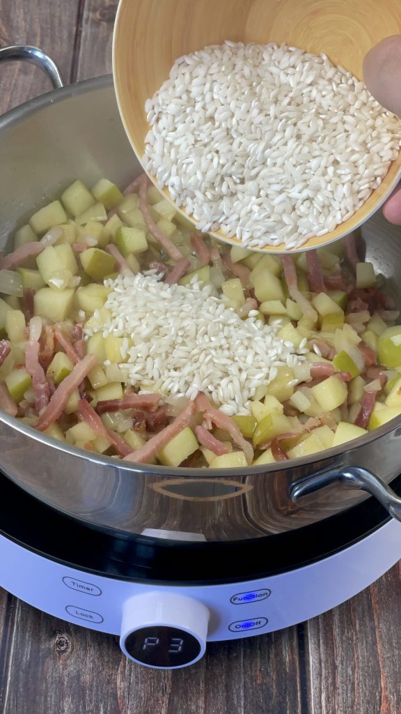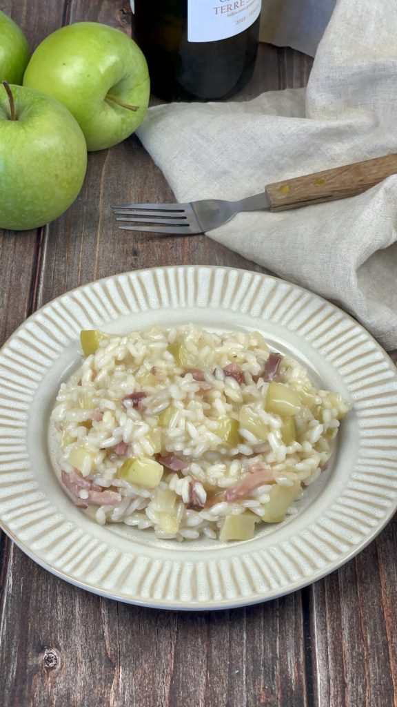 Risoto com maçãs e speck, um prato principal original e saboroso à base de arroz caracterizado pelo contraste doce/salgado criado pela união da maçã e do speck.
