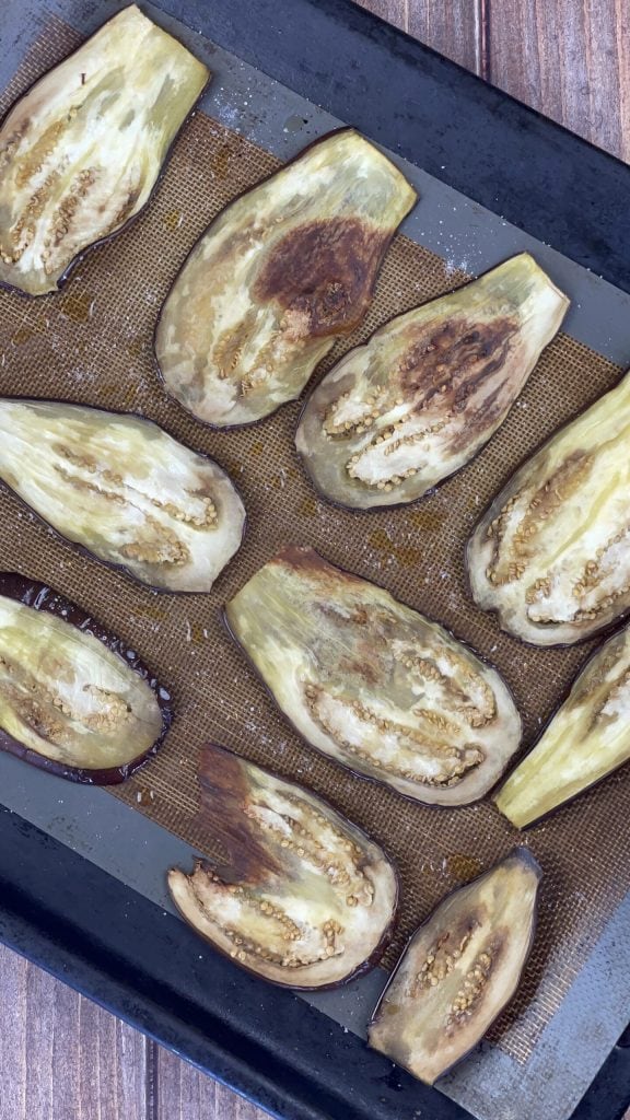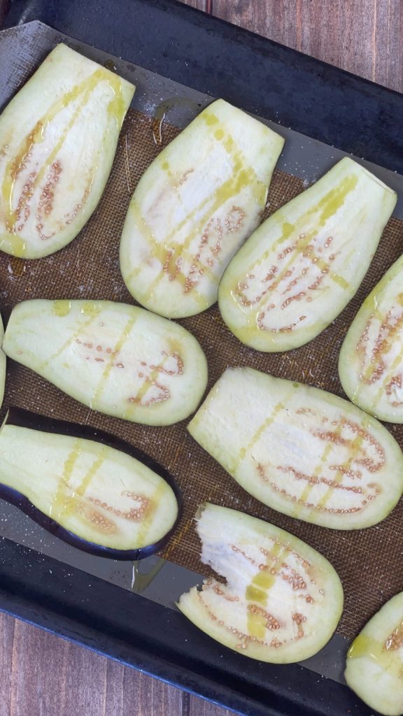 Transfira as fatias de berinjela para a assadeira e tempere com sal e azeite de oliva extravirgem.