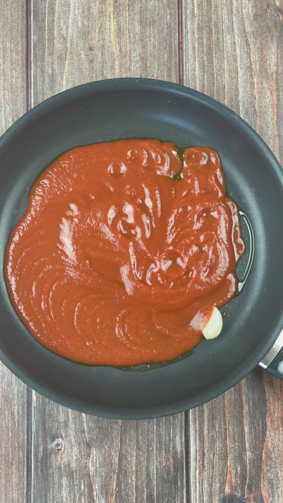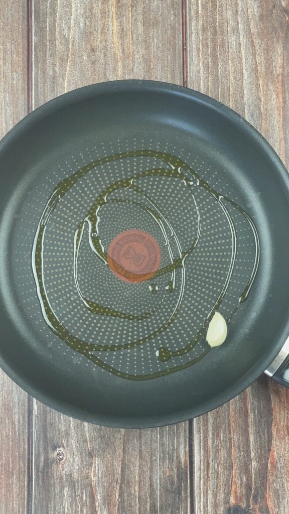 Aqueça na frigideira algumas colheres de azeite de oliva extravirgem com um dente de alho.