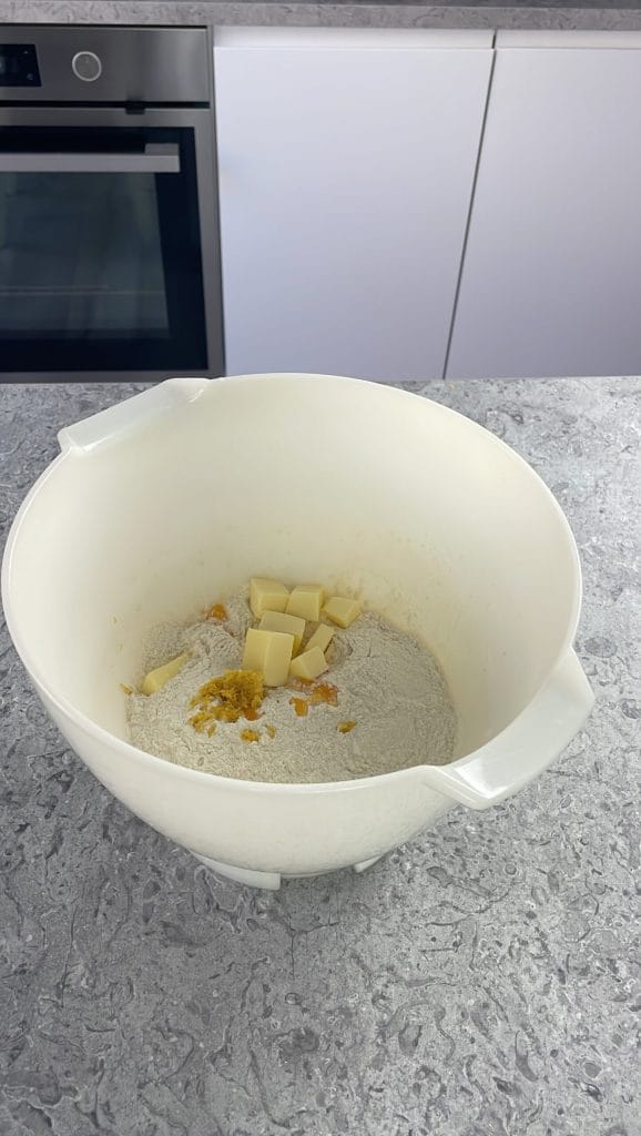 Continue adicionando o açúcar, a gema de ovo, a farinha Manitoba, a casca de limão e a manteiga em temperatura ambiente.