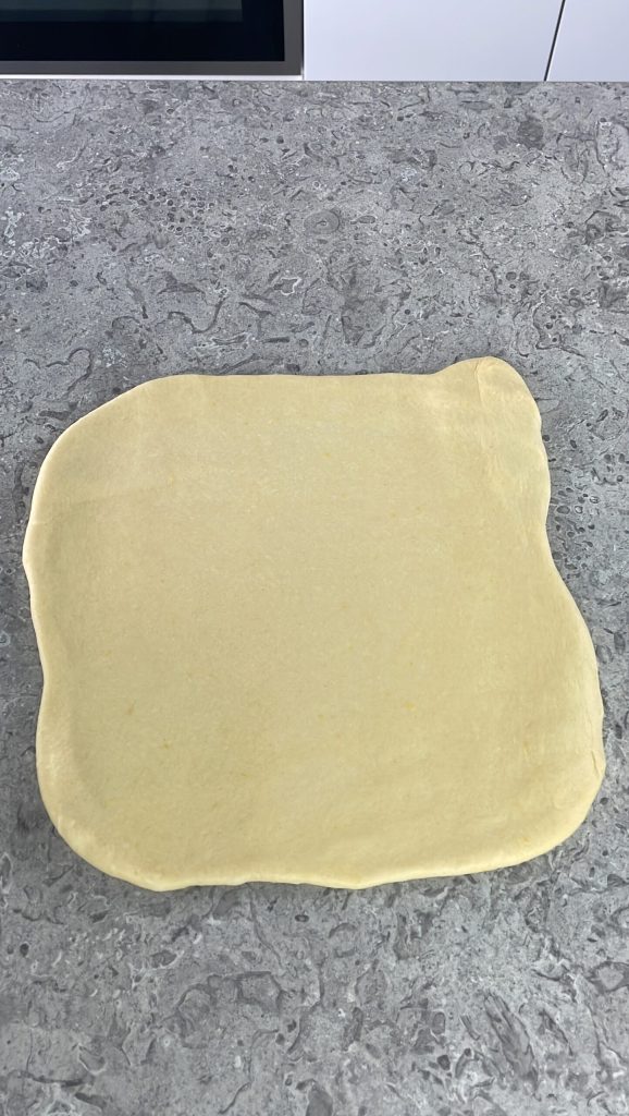 Pegue a massa fermentada e abra com o rolo formando um retângulo não mais grosso que 3-4 mm.
