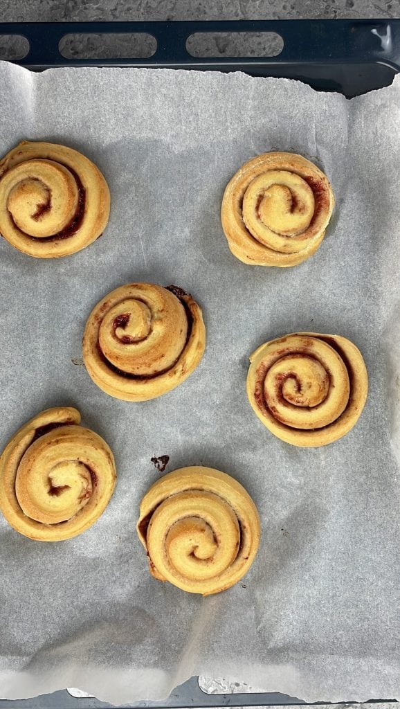 Asse os rolinhos de pan brioche com frutas vermelhas em forno pré-aquecido em modo estático a 180°C por cerca de 25 minutos ou até que fiquem dourados.