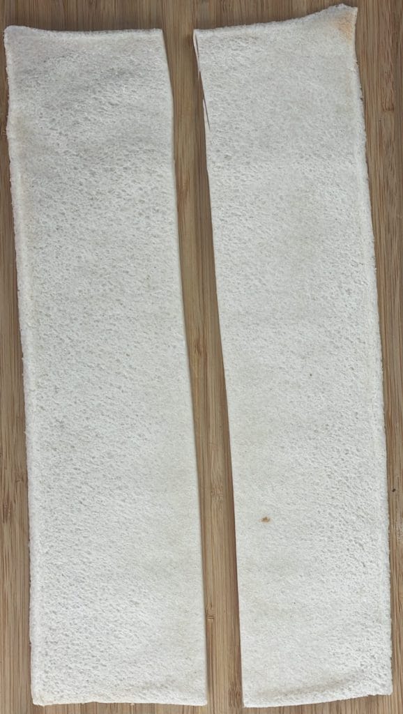Se preferir rosas menores, divida em três partes.Espalhe em cada tira de pão o queijo cremoso com uma faca ou com a espátula apropriada.