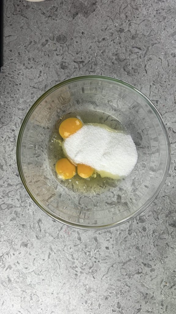Comece a preparação da rosca fofinha de azeite de oliva quebrando os ovos numa tigela. Coloque também o açúcar.