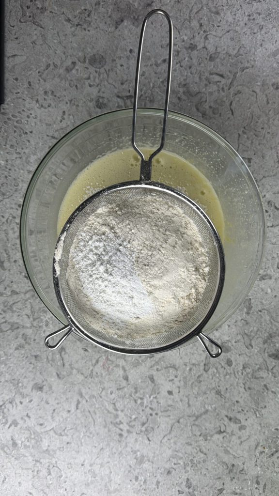 Peneire na tigela com os ingredientes úmidos a farinha tipo 00 e o fermento em pó para bolos.