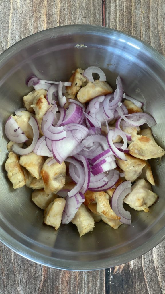 Misture até que toda a saladona de frango esteja perfeitamente temperada.