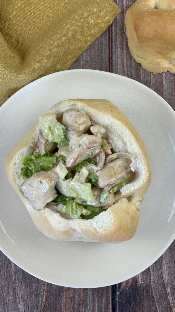 A preparação é muito simples, as rosettes são esvaziadas de seu miolo e recheadas com uma saladona à base de frango fresca e deliciosa.