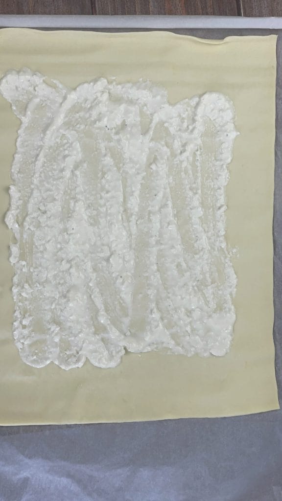 Coloque as fatias de abobrinhas sobre a ricota.Coloque no centro do retângulo de massa folhada também o salmão defumado.