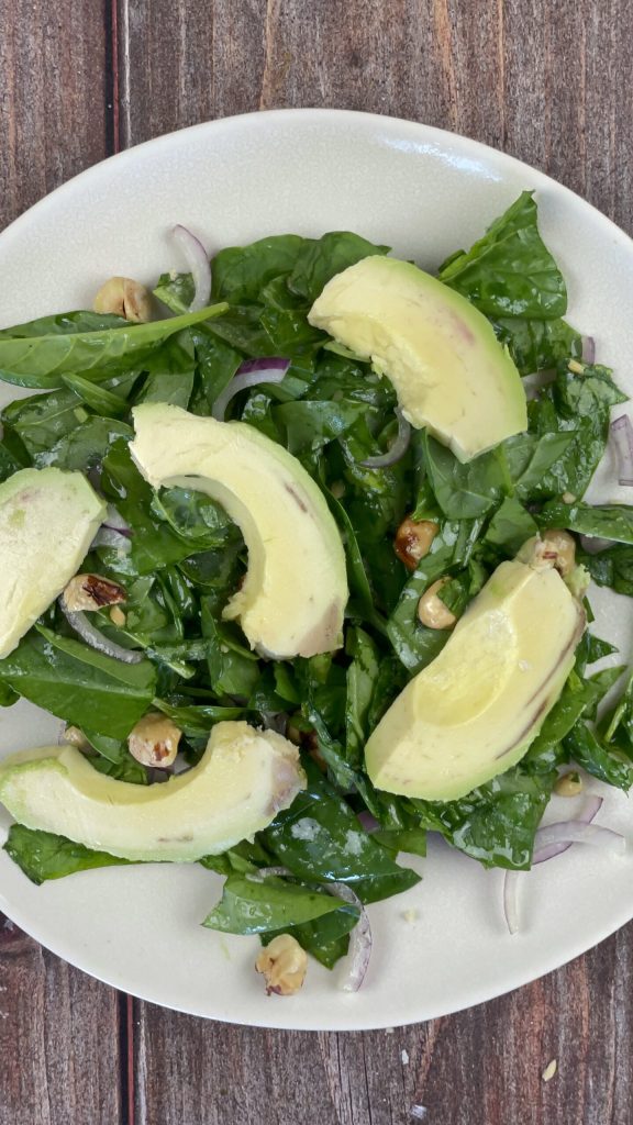 Mexa bem para distribuir o tempero de maneira uniforme.Adicione à salada de espinafres um abacate descascado, sem o caroço central e cortado em fatias