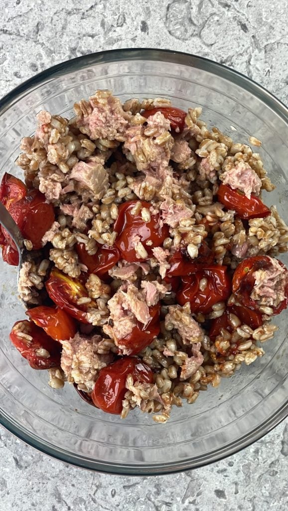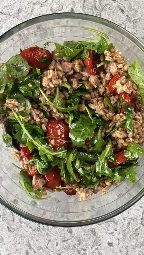 Salada de farro com atum, tomatinhos assados e rúcula – fresca e leve para o verão