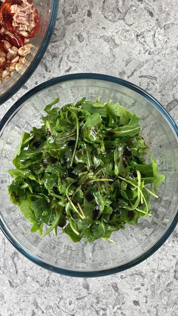 Misture bem para distribuir o tempero.Depois de lavada e seca, tempere a rúcula com sal, azeite de oliva extra virgem e vinagre balsâmico.