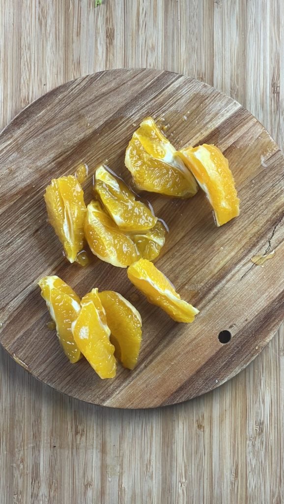 Faça fatias finas, se você tiver um mandolim pode usar também.Descasque as laranjas à vivo e depois em gomos.