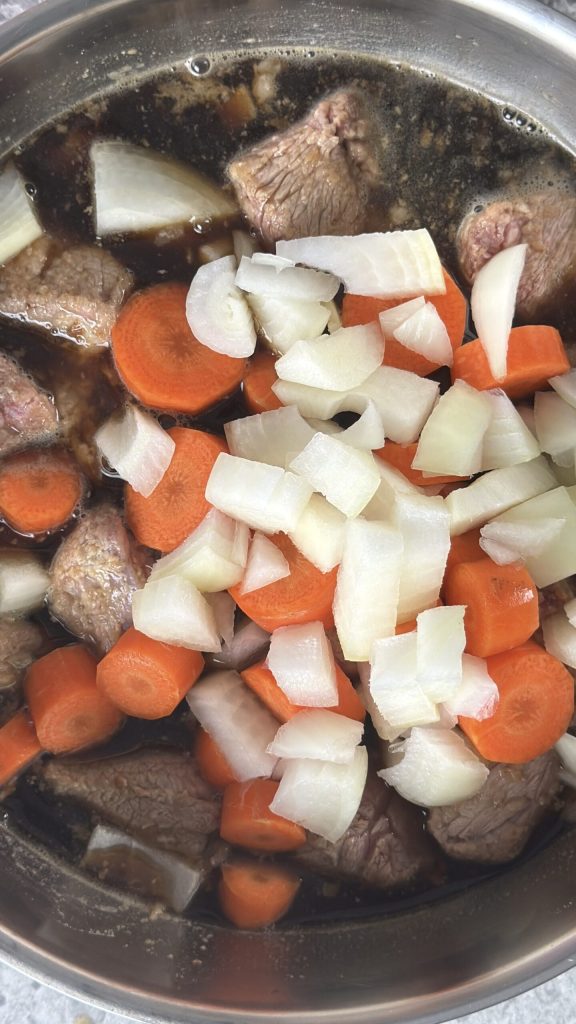 Lave e corte a cenoura e a cebola e adicione à carne.