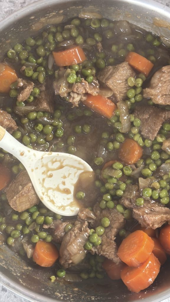 Após 45 minutos de cozimento, acrescente as ervilhas ao restante do ensopado.