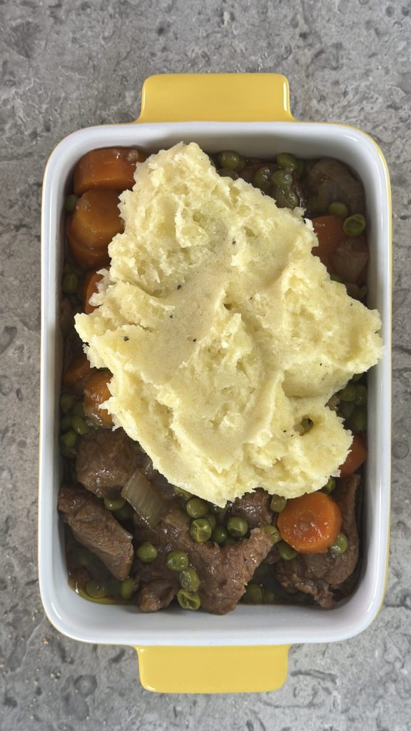 Finalize a preparação da Shepherd’s Pie à Guinness assando-a no forno com a função grill a 220°C até que o purê adquira uma bonita cor dourada.