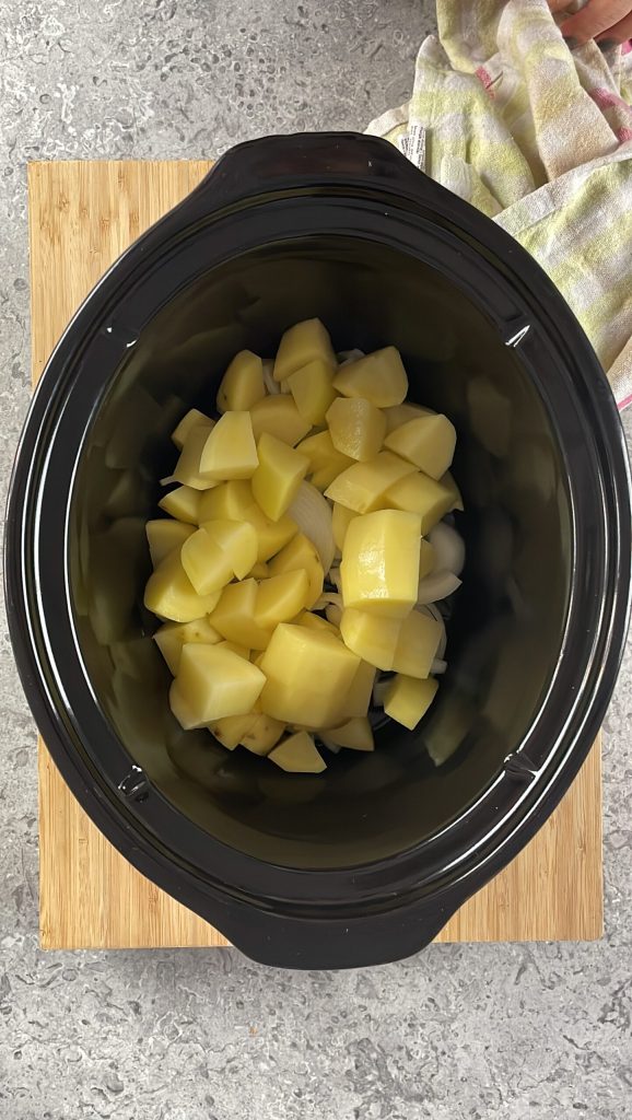 Adicione também a cebola e as batatas.Tempere tudo com pimenta-do-reino e tomilho seco.