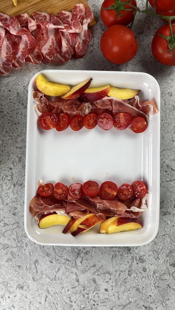 O pêssego nectarina, suculento e perfumado, adiciona uma nota fresca e frutada que combina perfeitamente com os frios. A abobrinha romanesca cortada finamente crua proporciona crocância e um toque verde que dá cor à tábua. Os tomatinhos, junto com a mozzarella de búfala, trazem o verão à mesa com sua simplicidade.
