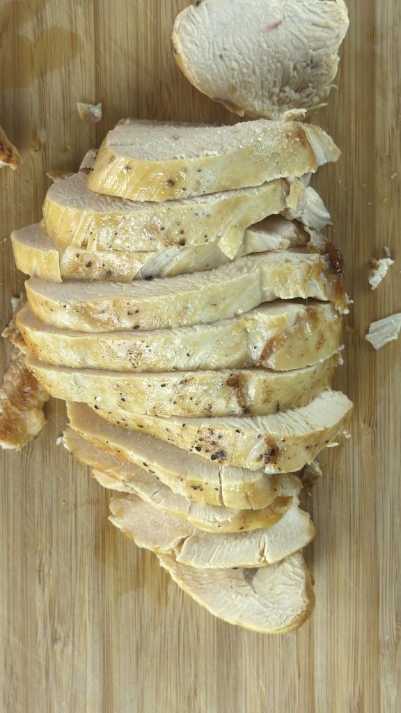 • Deixe o peito de frango descansar por 5 minutos e depois corte-o em fatias finas.